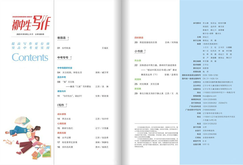 《初中生寫作》雜志是一本集知識性、實用性、互動性于一體的優(yōu)秀刊物,以豐富的內(nèi)涵、新穎的形式、深入淺出的講解,為初中生提供了一本難得的寫作指南。無論是想要提高寫作技巧的學生,還是對文學充滿熱情的讀者,都能在這本雜志中找到自己想要的答案。