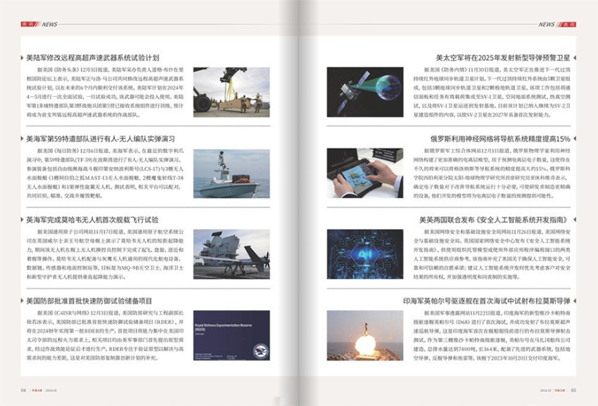 雜志秉承服務(wù)國防、服務(wù)軍隊(duì)、服務(wù)讀者的宗旨,以導(dǎo)向性、前瞻性、可讀性為特點(diǎn),致力于為廣大讀者提供高質(zhì)量的軍事資訊和學(xué)術(shù)研究成果。雜志內(nèi)容涵蓋了國內(nèi)外軍事戰(zhàn)略、武器裝備、軍事科技、戰(zhàn)爭理論、歷史回顧等多個(gè)方面,旨在為讀者呈現(xiàn)一幅全面、深入的軍事畫卷。雜志聚焦當(dāng)前熱點(diǎn)軍事話題,對(duì)重大事件進(jìn)行深度解讀,為讀者提供及時(shí)、準(zhǔn)確的軍事信息;分析國際和地區(qū)安全形勢(shì),預(yù)測(cè)軍事發(fā)展趨勢(shì),為讀者揭示戰(zhàn)爭與和平背后的權(quán)力博弈;介紹國內(nèi)外最新武器裝備研發(fā)動(dòng)態(tài)、技術(shù)特點(diǎn)和實(shí)戰(zhàn)性能,為讀者展現(xiàn)軍事科技的魅力。