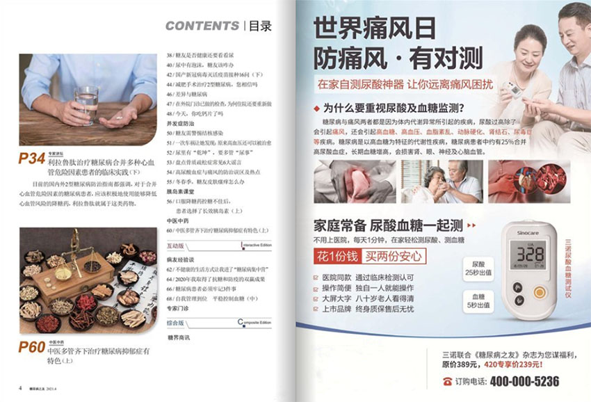 《糖尿病之友》是一本在國內(nèi)外發(fā)行的糖尿病教育雜志,致力于指導糖尿病患者的日常生活,提供科學、實用的知識和信息。雜志旨在增強讀者的健康意識,為讀者解答疑惑,提供經(jīng)驗與教訓,并促進讀者之間的互動與交流。