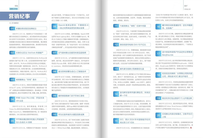 重點(diǎn)欄目介紹:營(yíng)銷紅黑榜:盤點(diǎn)月度出圈營(yíng)銷事件,篩選出紅榜和黑榜,進(jìn)行剖析銳評(píng),為企業(yè)提供創(chuàng)新思路,規(guī)避翻車風(fēng)險(xiǎn)。問鼎案例(大案例):大篇幅重磅企業(yè)案例解讀,對(duì)頭部標(biāo)桿企業(yè)、單項(xiàng)冠軍、隱形冠軍、熱點(diǎn)潛力企業(yè)等,行業(yè)頭部、標(biāo)桿案例進(jìn)行全方位拆解,突出專業(yè)和權(quán)威,體現(xiàn)方法、過程、細(xì)節(jié),為其他企業(yè)提供實(shí)踐對(duì)標(biāo)。